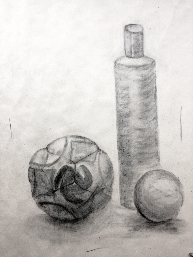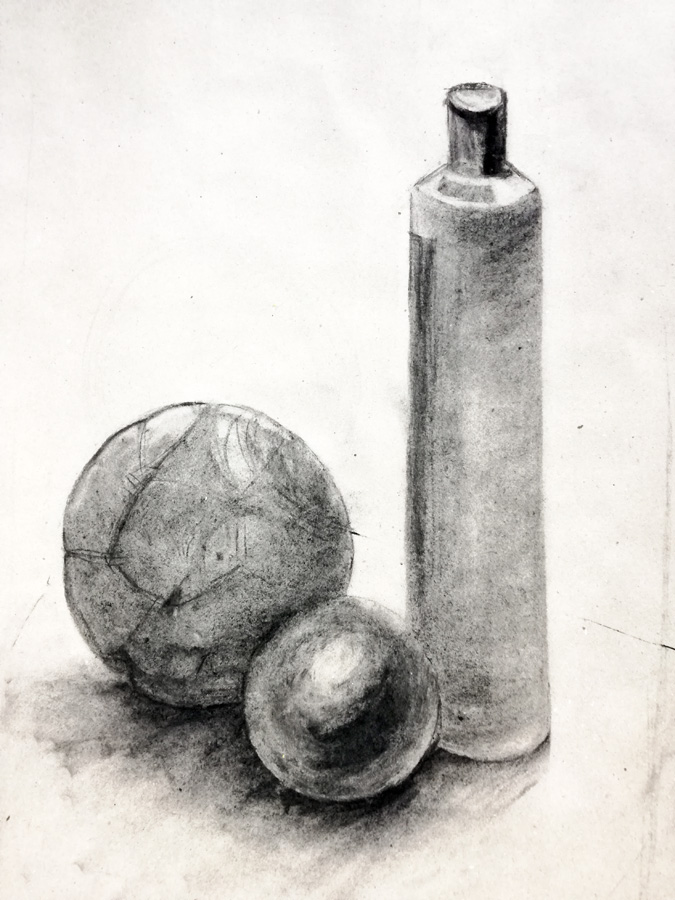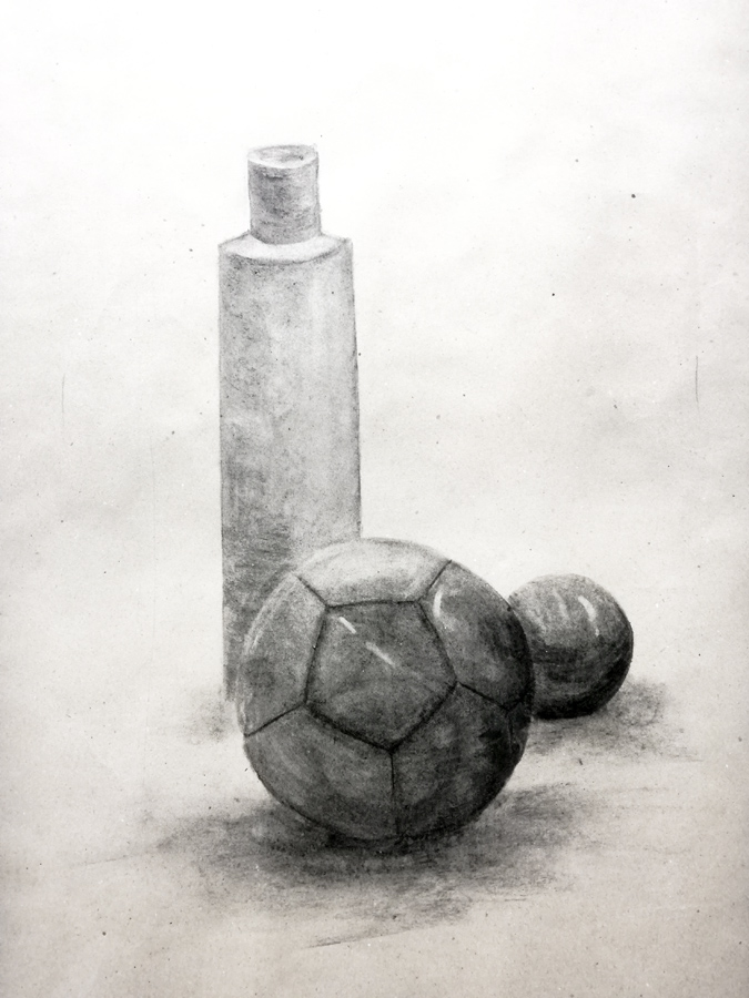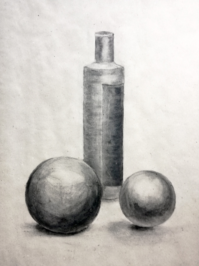 Zátiší s lahví a několika koulemi. Uhel na balícím papíře.