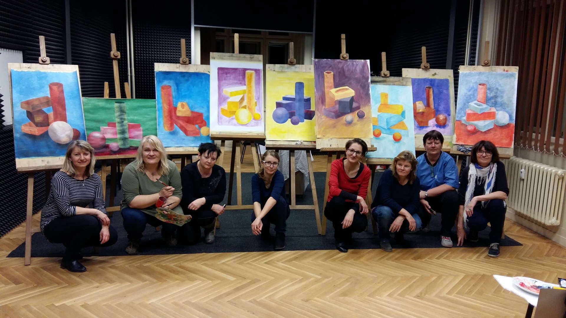 Jsme skupina převážně děvčat, která se rozhodla zkusit si kreslení a malování. Některé z nás držely v rukou úhel, křídu či štětec naposledy ve školních lavicích.